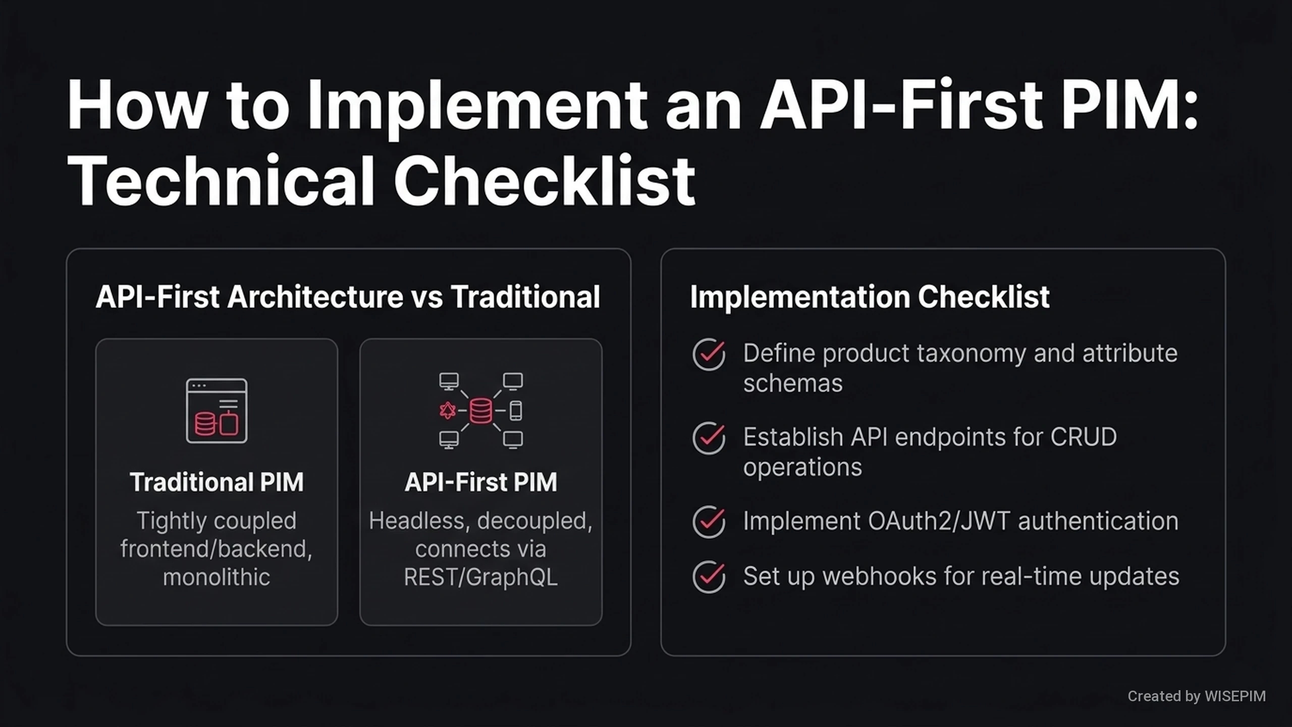 An API-First PIM is a software tool built around its connection points. These points are called APIs. An API is a set of rules that lets different programs talk to each other. In this system, every feature is available through an API from the very beginning. This approach is often called headless because the data is kept separate from the visual display. This structure allows the PIM to share data directly with webshops, ERP systems, and mobile apps. It makes it easier to send product information to many different sales channels at once. If the PIM has a dashboard, that dashboard uses the same API connections as any other app. WISEPIM uses this architecture to help you connect your data to any modern e-commerce platform.