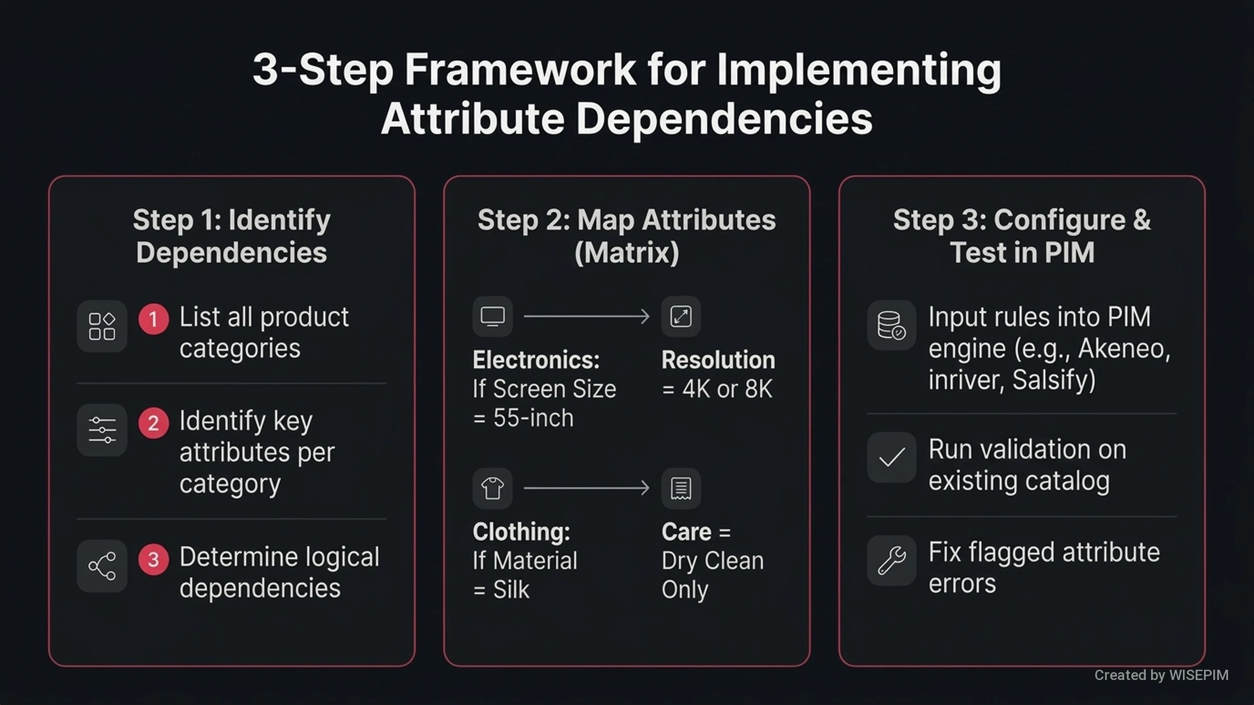 - WISEPIM links product details together using rules. This ensures customers only see and buy product versions that actually exist.