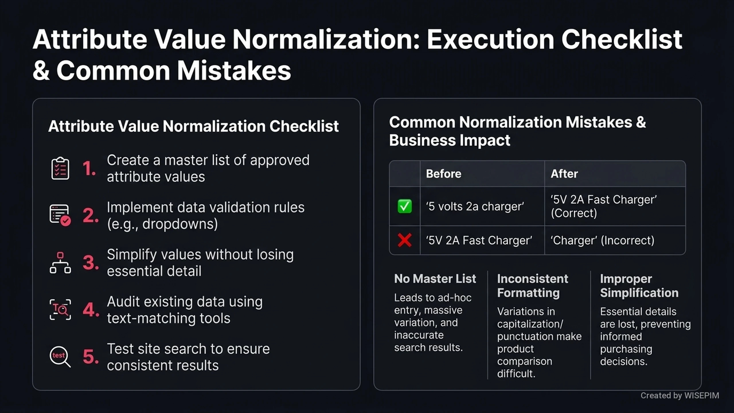 Attribute value normalization is the process of organizing product details into a single, standard format. It ensures that every product uses the same name for features like color, size, or material. For example, you might change "L", "Large", and "Lrg" all to "Large". This keeps your data clean and easy to manage. Consistent values help customers find products quickly. If one shirt is "Navy" and another is "Dark Blue", a filter for "Blue" might miss one. Normalization maps these different names to one standard term so filters work correctly. WISEPIM automates this process to keep your product catalog professional and easy to search.