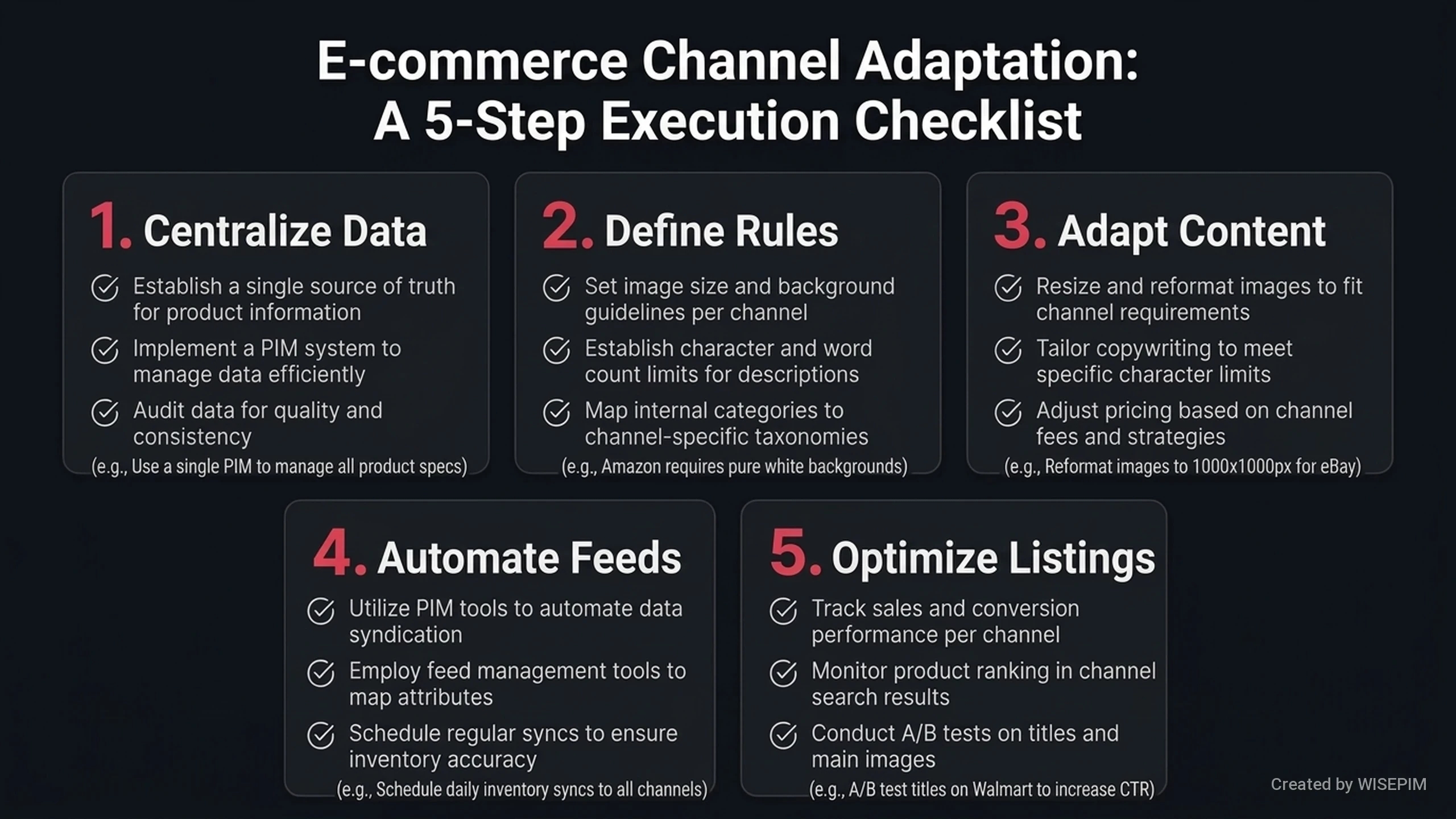 - Automatic adjustments in WISEPIM reduce manual work. The system changes product data to meet the specific rules of each sales channel.