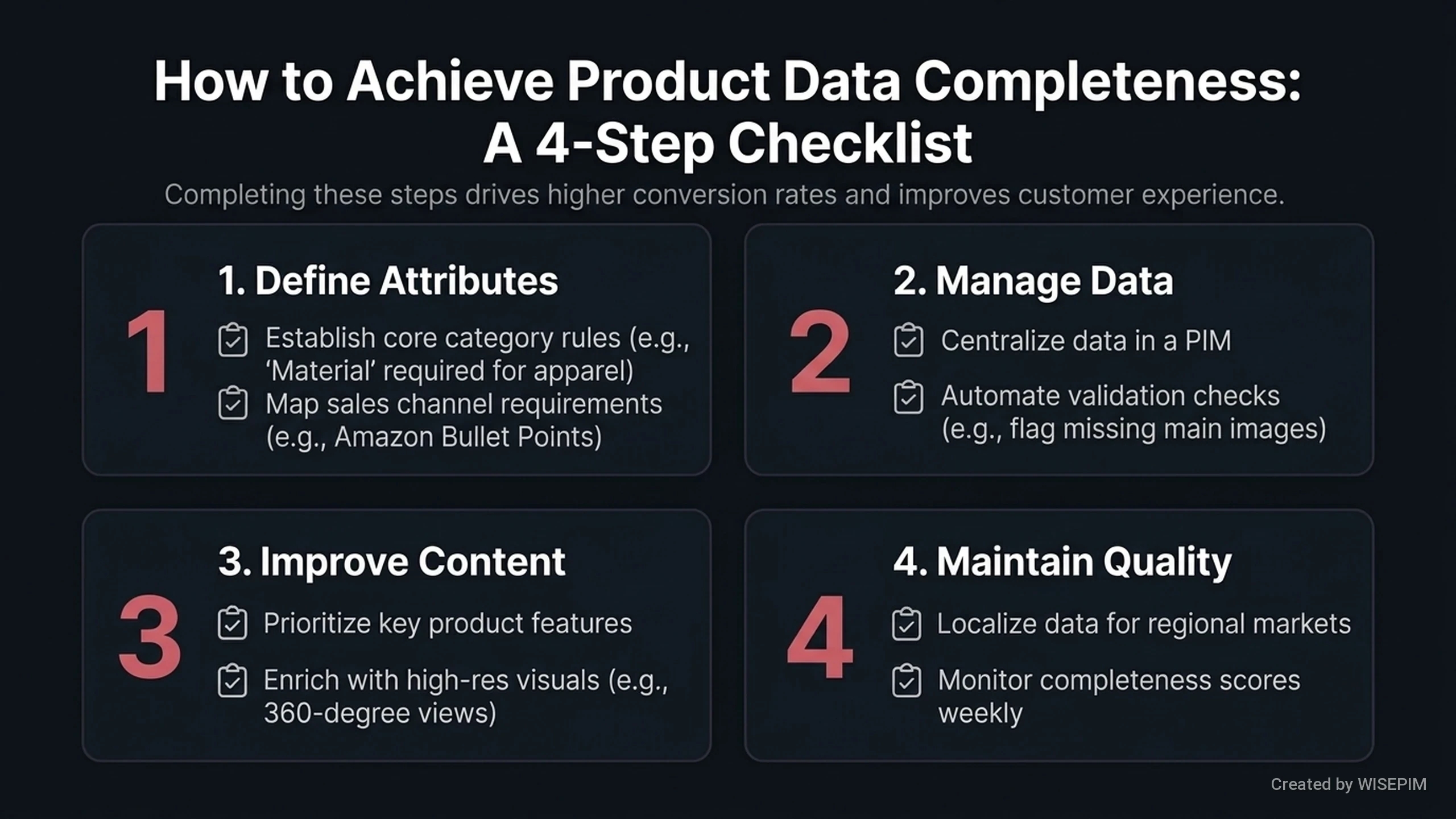 **Completeness** is a measure of how much required information a product listing contains. It shows if a product page has all the details a customer needs to make a purchase. Full details build trust and help buyers feel confident. Missing data like size guides or technical specs causes frustration. This often leads to more returns and lost sales. Search engines rank pages higher when they have thorough descriptions and high-quality images. This brings more visitors to your online store. Completeness also ensures your listings meet the rules of different marketplaces. This prevents product rejections and makes it easier to share data with partners. A PIM system like WISEPIM helps you monitor these data gaps across your entire catalog.