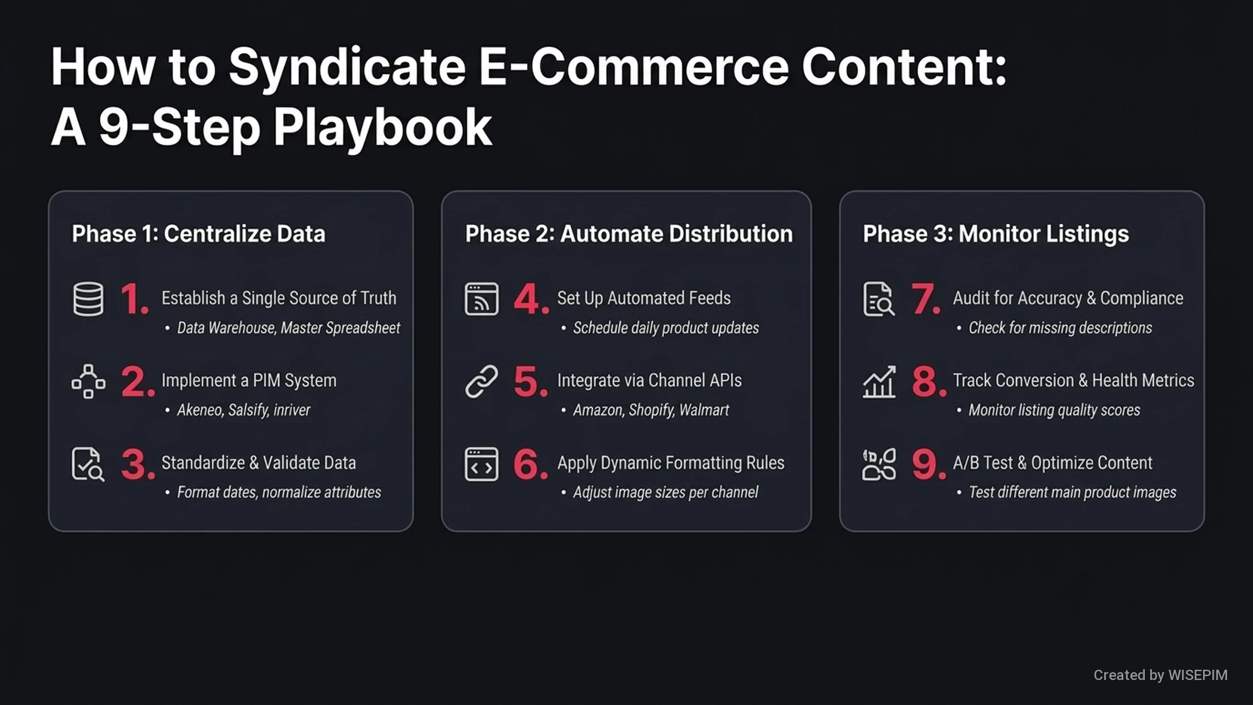 Content syndication is a process that sends product information from one central system to many different sales channels. It shares details like descriptions, images, and videos with marketplaces, retail partners, and social media shops. This allows you to manage all your data in one place instead of updating each website manually. This method helps you reach more shoppers while keeping your product information accurate. It saves time by removing the need for manual data entry on every platform. WISEPIM automates this by formatting your data to meet the specific rules of each sales channel.