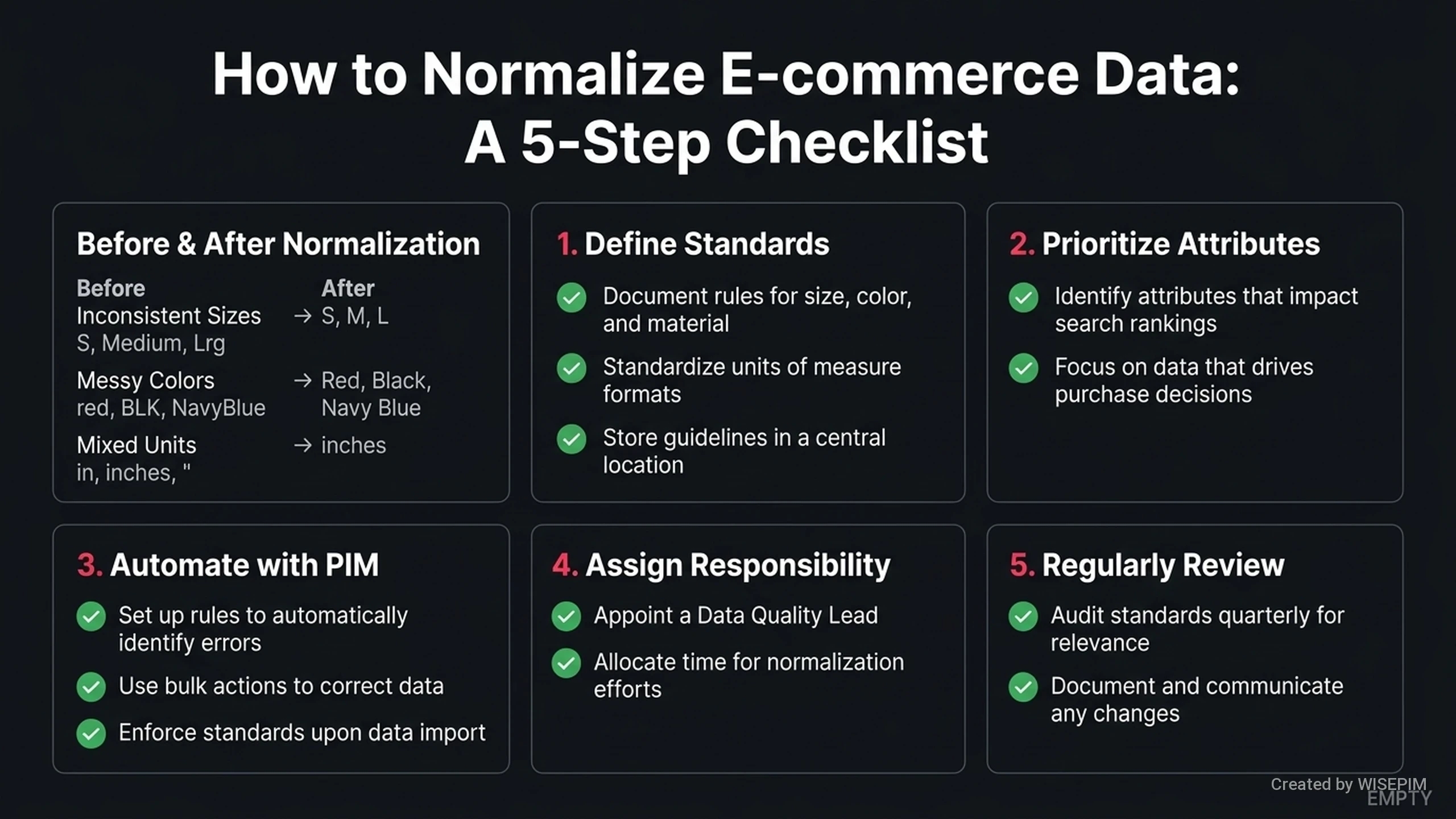 Data normalization is the process of organizing product information into a standard format. In e-commerce, this ensures that details like sizes and colors look the same across your entire store. Without it, one shirt might list a size as "Large" while another says "L." These differences break search filters and confuse shoppers. A PIM system like WISEPIM fixes this by converting messy data into a uniform structure. This helps customers find products quickly and keeps your inventory reports accurate. It also removes the need for staff to fix data errors by hand. Clean data leads to better search results and higher sales.