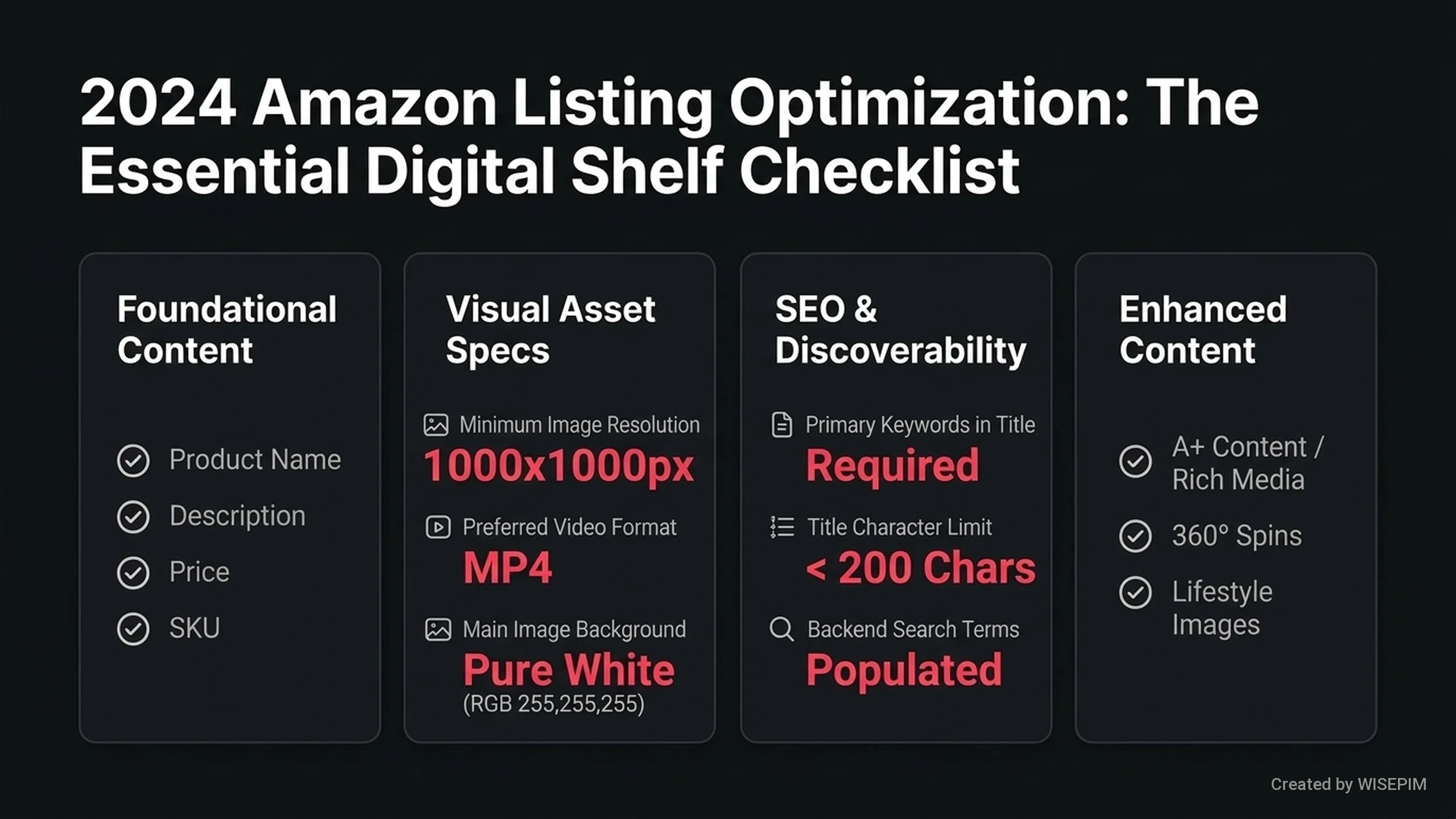 Digital shelf content requirements are the rules and standards that product data must follow to appear on online stores. These rules change depending on the retailer or marketplace. They ensure that every product listing has the correct details in the right format. These standards cover more than just names and prices. They often include: * Specific image sizes and video formats * Character limits for titles and descriptions * Keywords that help shoppers find products * Platform-specific categories and attributes * Enhanced layouts like A+ content Following these rules helps products rank higher in search results. It gives customers the clear information they need to buy a product. WISEPIM helps brands manage these different requirements for every sales channel from one central place.
