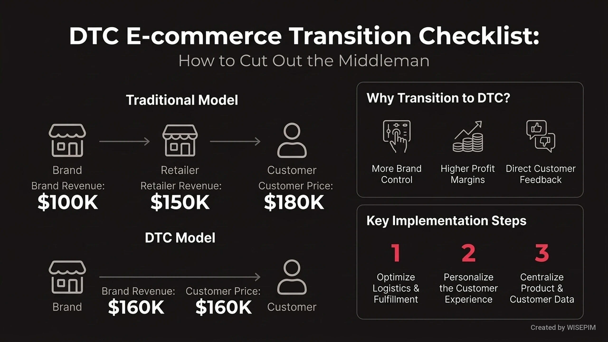 Direct-to-Consumer (DTC) E-commerce is a business model where a brand sells products directly to customers. The company sells through its own website instead of using wholesalers or retail stores. This method helps brands build a direct relationship with their buyers. They can see how people shop and keep full control over their brand image. DTC brands often focus on personal marketing and clear storytelling. Managing everything from production to shipping can be complex. The benefits include higher profit margins and faster feedback from customers. Brands can also update their products quickly based on what people want. Using a tool like WISEPIM helps these brands keep product data accurate across their online store.