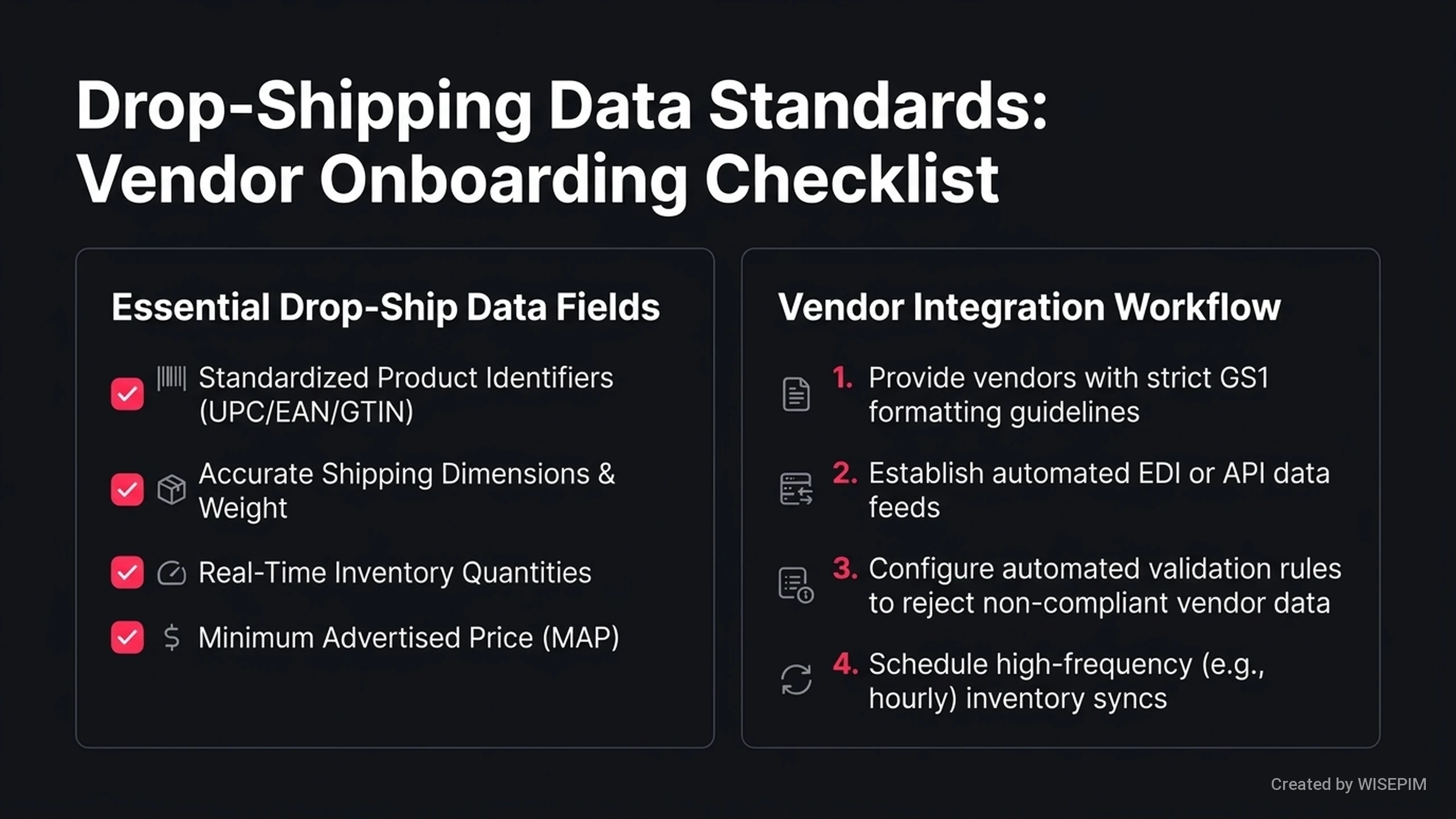 Drop-shipping data standards are rules for how suppliers and retailers share product information. These rules cover details like stock levels, prices, and order updates. Retailers do not keep physical stock in drop-shipping. They must use the supplier's data to show products accurately on their websites. These standards organize data like SKU (product codes), prices, and stock counts. Systems share this data through formats like CSV files or API connections. Using these standards removes the need to fix files manually every time a supplier sends an update. Without clear standards, retailers might sell items that are out of stock. They might also show the wrong product details to customers. Good standards ensure that updates happen automatically. When a supplier changes a price, the new price shows up on the retailer's site immediately. Tools like WISEPIM help manage these data flows to keep information accurate across all channels.