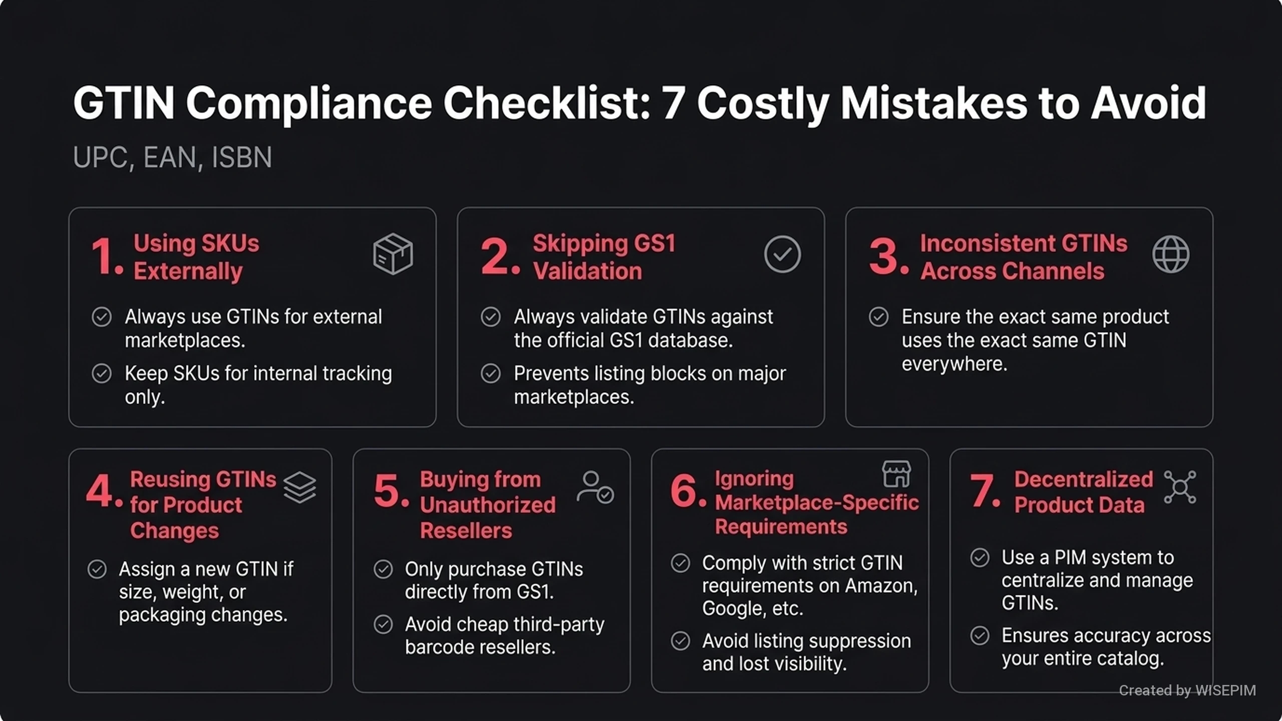- WISEPIM checks your GTINs for errors to keep your data accurate. This ensures every product has a unique code and prevents listing mistakes.