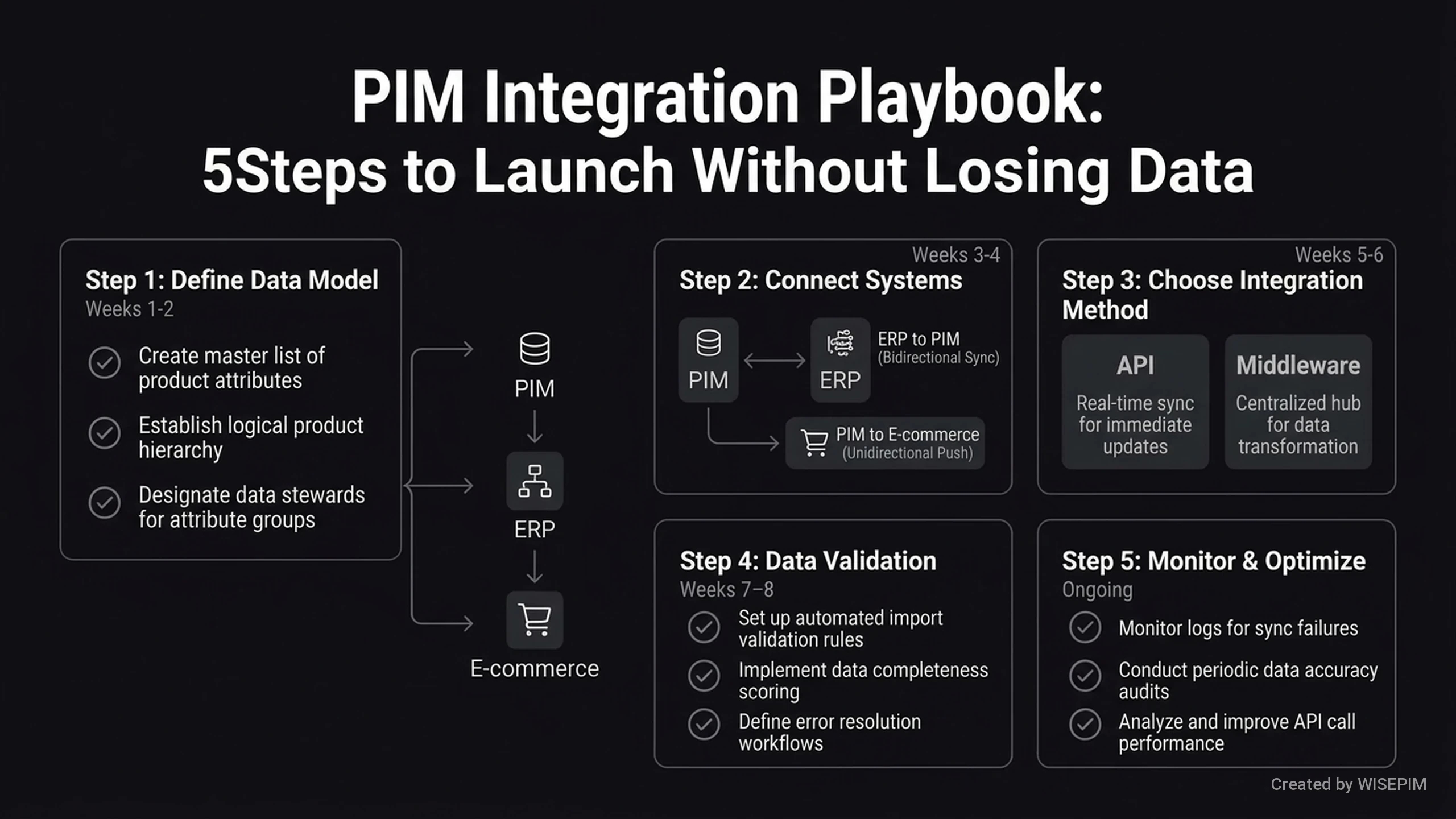 A PIM integration strategy defines how a PIM system connects and exchanges data with other enterprise systems like ERP, e-commerce platforms, and DAM.