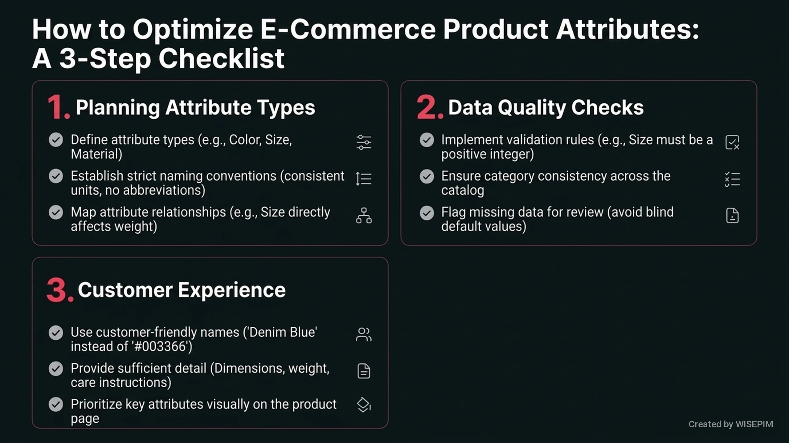 A product attribute is a specific detail that describes an item. It tells customers what a product is and how it looks or works. Common attributes include size, color, brand, and material. Technical details like weight or power usage are also attributes. These details help shoppers compare items and find exactly what they need. They also help businesses sort and group their products. WISEPIM helps you organize these details so your product information stays accurate across all sales channels.