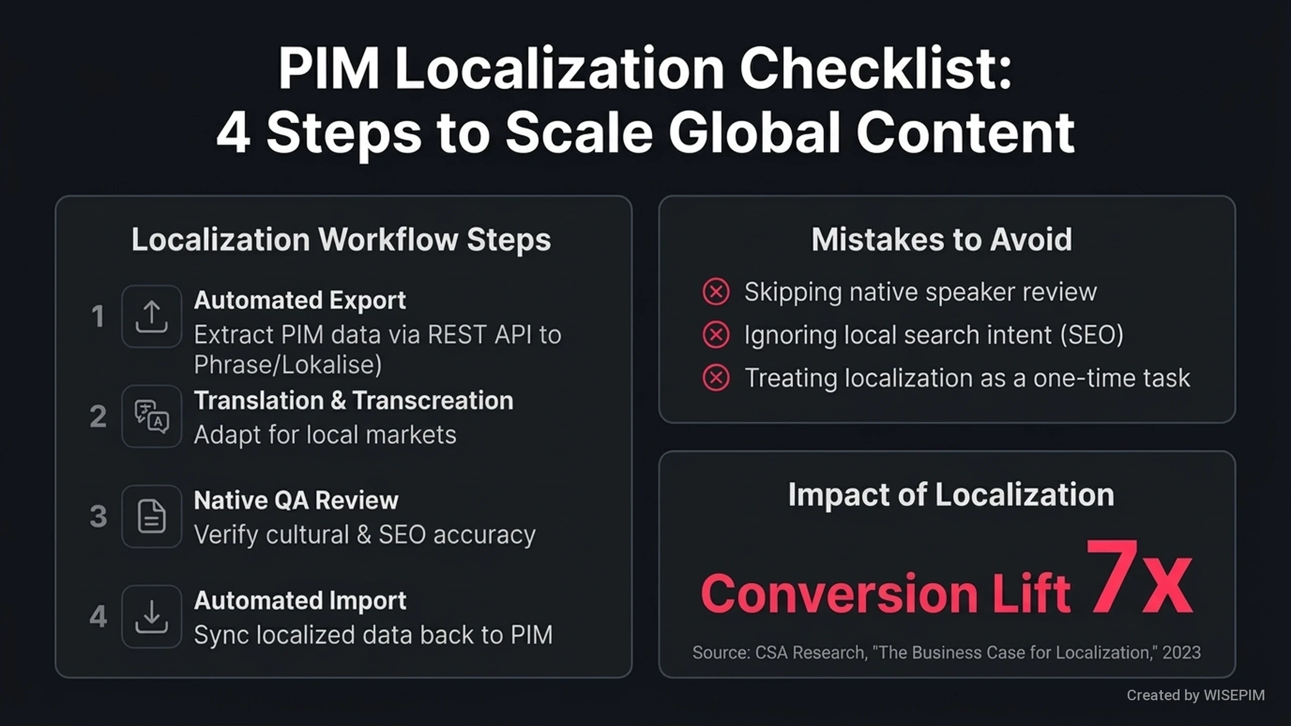 A product content localization workflow is a step-by-step process to adapt product details for different languages and regions. It ensures that your product information feels natural to local shoppers. This process helps sellers speak to customers in their native language. It builds trust and makes it easier for people to buy your products in new markets. Without a clear plan, translations often take too long or have mistakes. These errors can confuse shoppers and delay your product launches. A good workflow ensures every description and price fits the local market. Using a tool like WISEPIM helps teams manage these tasks in one central place. This keeps your global data accurate and helps you enter new markets faster.