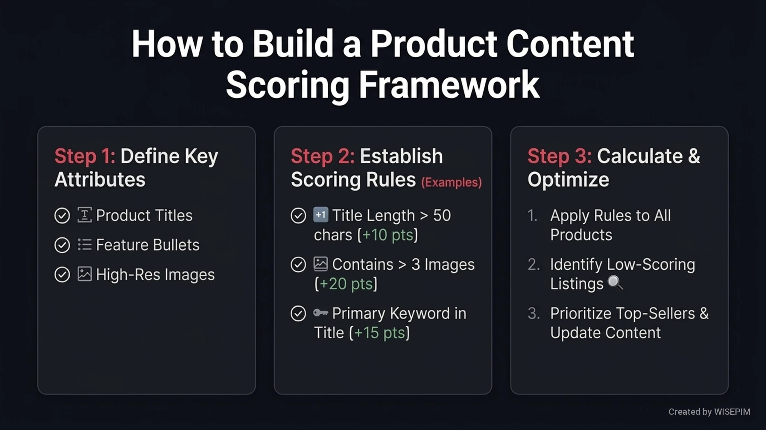 Product Content Scoring is a tool that grades the quality of your product data. It measures how complete and accurate your information is. This system points out products that need better descriptions or more images. It highlights missing details like weight or color. Good content helps customers trust your brand. It gives them the facts they need to buy with confidence. Checking thousands of products for errors by hand takes too much time. Incomplete data makes your products harder to find in search results. Product Content Scoring helps you find and fix these mistakes quickly. Better product pages lead to more sales and fewer returns. This system also makes sure your data meets the rules of sites like Amazon or Google Shopping. Tools like WISEPIM use scoring to help you keep your catalog perfect.