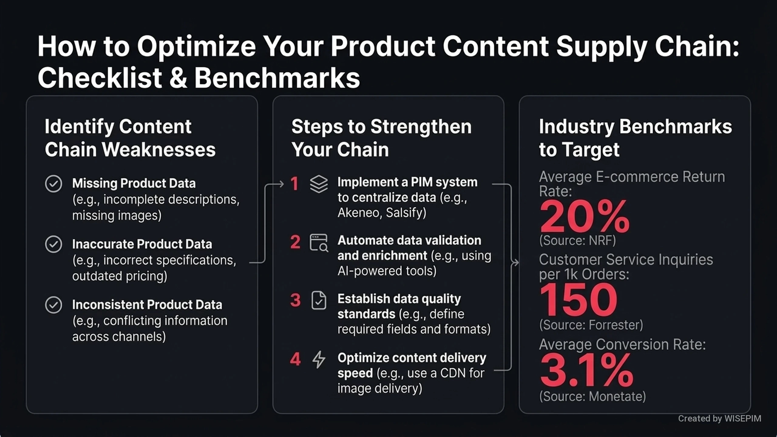 A product content supply chain is the path product information takes from its source to the customer. It starts with raw data from suppliers. You then move this data into a central system like a PIM. In this chain, you clean and improve the data. You add marketing text, images, and translations. Finally, you check the data for errors. The goal is to create a Golden Record. This is a single, perfect version of your product data. This record is ready to use on all your sales channels. Physical supply chains move real goods. A content supply chain moves the digital information that helps sell those goods. Many people work in this chain, including product managers and writers. A smooth chain removes delays and manual work. It ensures correct data reaches webshops and marketplaces quickly. Using a tool like WISEPIM helps you manage this flow efficiently.