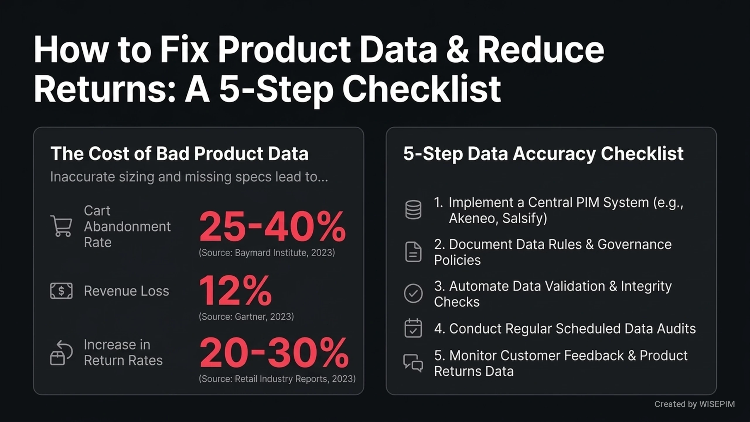 Product data accuracy is how correctly your digital information matches the physical product. It ensures that details like size, weight, and price are correct and current. If a customer receives a blue shirt after ordering a red one, the data was inaccurate. Incorrect data leads to more returns and unhappy customers. Wrong safety details or prices can also cause legal problems for your business. Companies maintain accuracy through regular checks and data audits. WISEPIM helps by automating these checks to keep your data reliable on every sales platform.