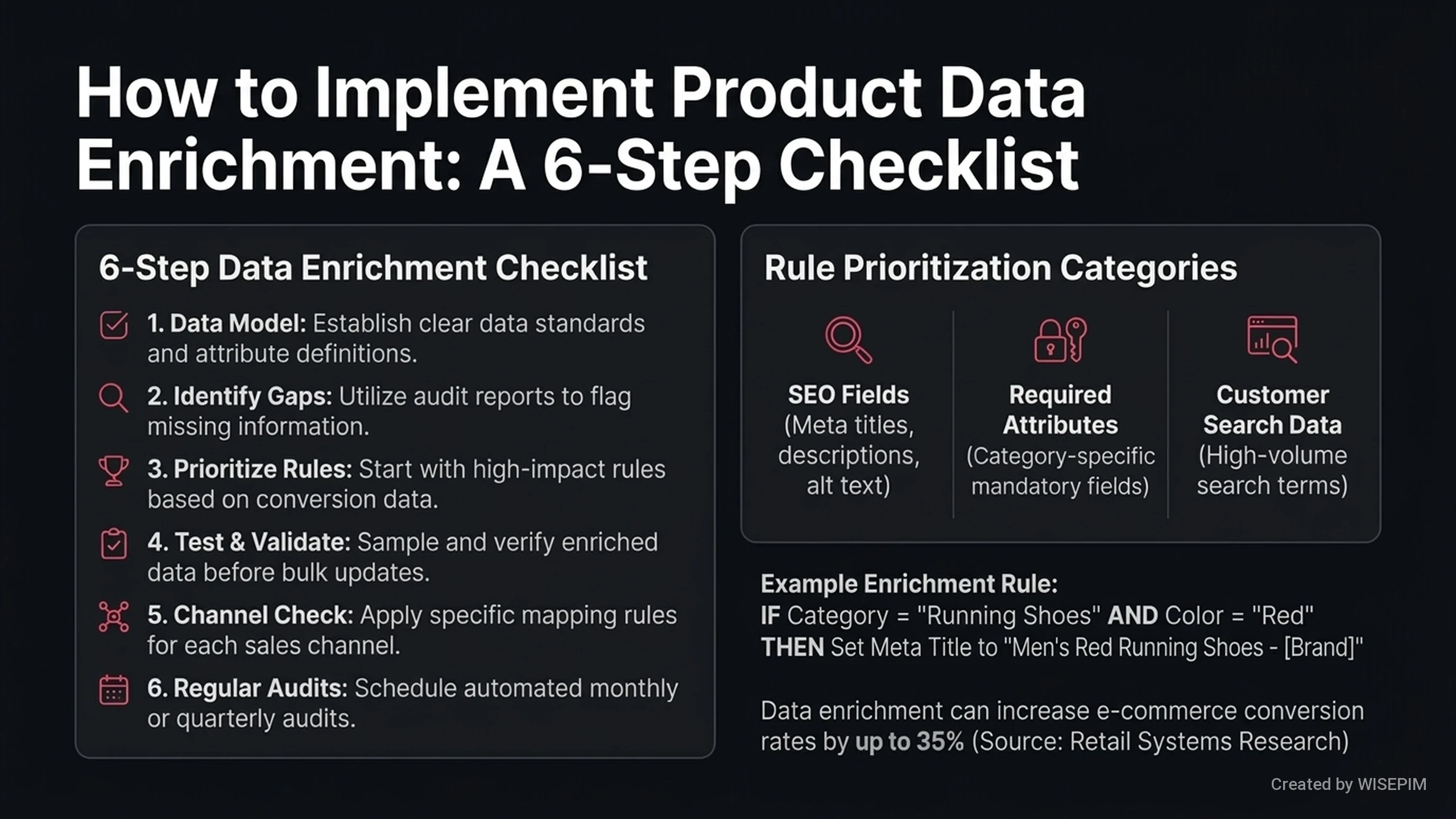 Product data enrichment rules are automated instructions in a PIM system that improve product information. These rules work like "if-then" commands to update data automatically. They fill in missing details and fix errors across your catalog without manual effort. These rules handle several common tasks: * Converting measurements like inches to centimeters. * Making color names or technical specs consistent. * Adding tags based on the product category. * Connecting images to products using file names. Using these rules keeps your data accurate and professional. They help you get products ready for your webshop much faster. WISEPIM uses these rules to handle repetitive tasks. This reduces human error and lets you launch new items quickly.