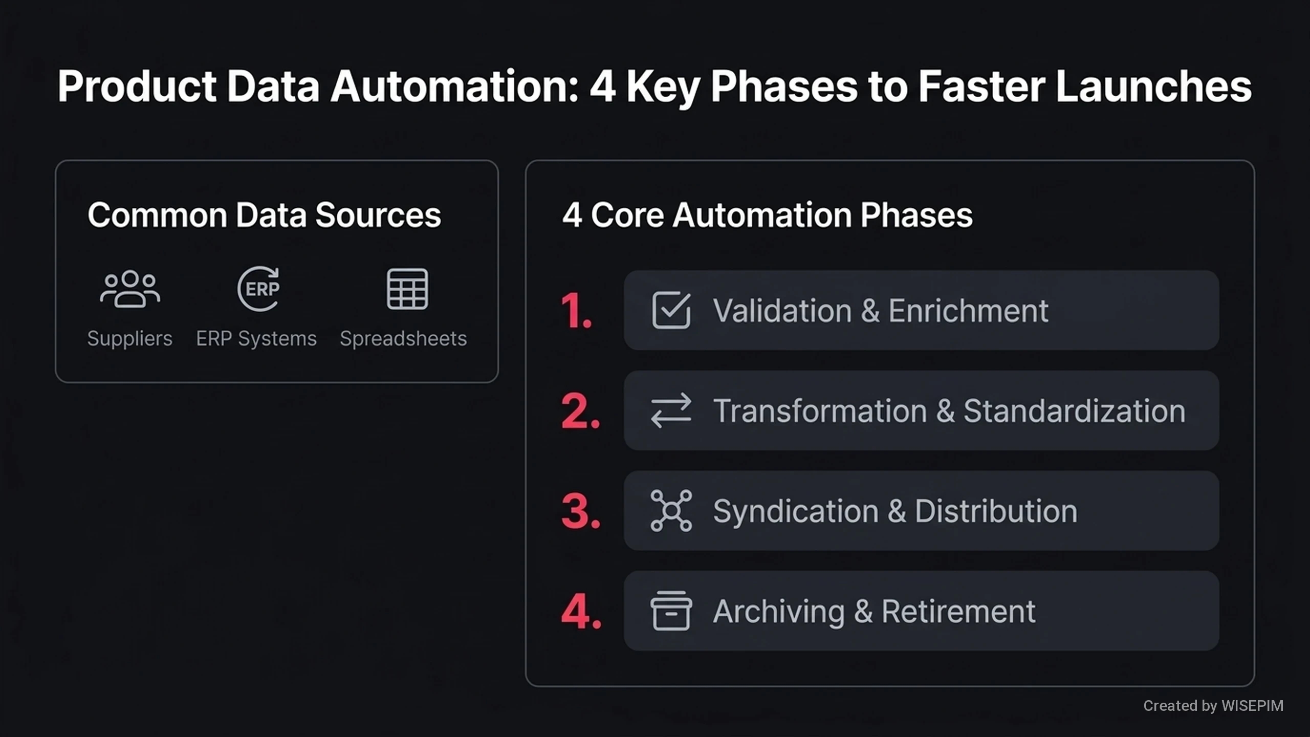 - WISEPIM automates every stage of a product's lifecycle. It handles everything from adding new items to removing old ones from your catalog.