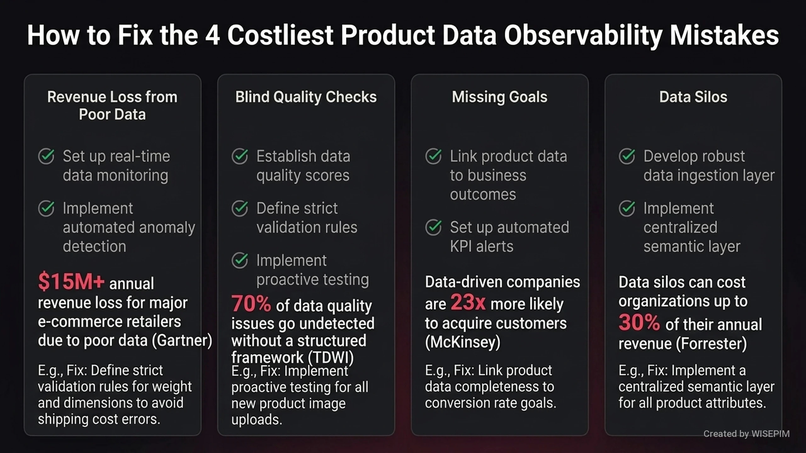 Product Data Observability is a process that monitors the health and accuracy of your product information. It tracks how data moves through your systems to ensure every listing is complete and correct. High-quality data builds customer trust and reduces product returns. This system helps you find errors quickly across different webshops and marketplaces. For example, it can alert you if a price is wrong or an image is missing before a customer sees it. Fixing these mistakes early prevents lost sales and bad reviews. Tools like WISEPIM provide this visibility to keep your sales channels reliable.