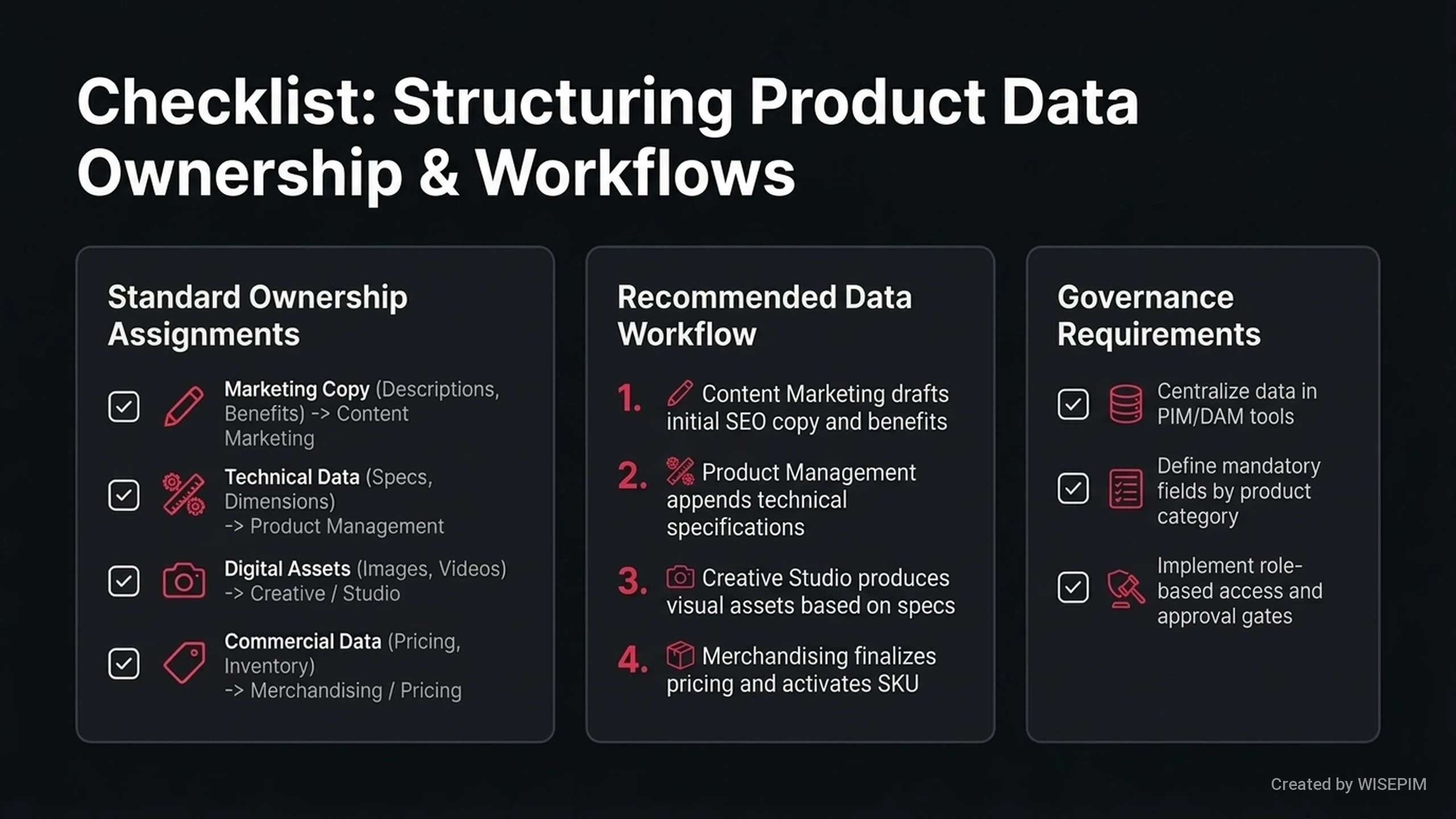 Product data ownership is the practice of assigning specific people or teams to be responsible for certain product information. This ensures every piece of data has a clear leader who manages its accuracy. Without owners, product details often become outdated because no one knows who should update them. Different departments usually own different data sets. Marketing manages product descriptions and images. Engineering handles technical specifications. Logistics tracks shipping weights and dimensions. Assigning ownership prevents data silos, which are isolated pockets of information. It gives teams the authority to check information before it goes live. A system like WISEPIM helps you track these responsibilities. This keeps your data consistent across all sales channels.