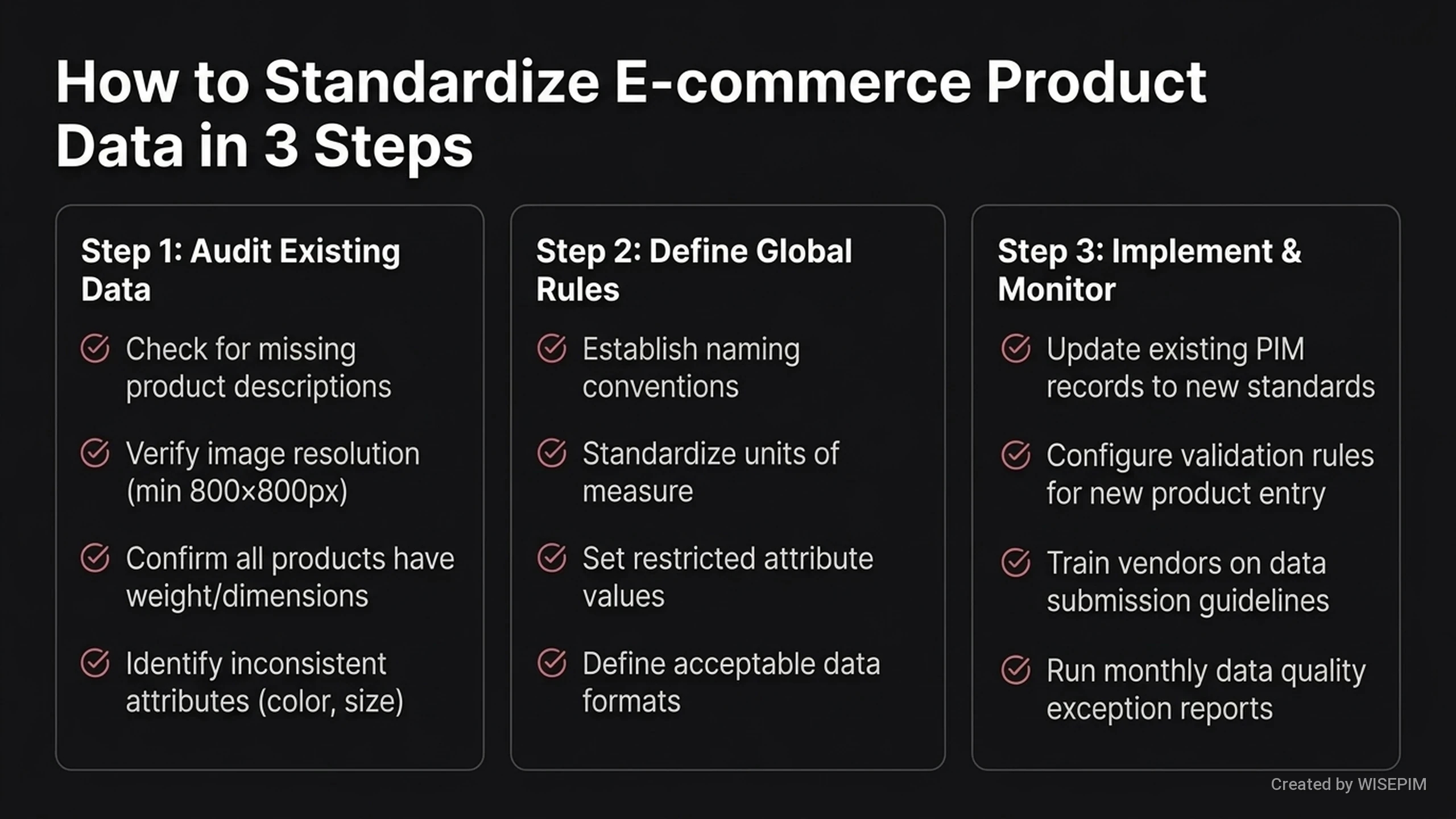 Product data standardization guidelines are sets of rules that keep your product information consistent. These rules ensure that every listing uses the same units, terms, and layouts. For example, they make sure all weights use "kg" instead of mixing "kilograms" and "lbs." This consistency helps customers find and compare items easily. Standardized data helps search engines and site filters work better. When your information is uniform, your products show up more often in search results. These guidelines also save time for your team. They can add or update products faster when they follow a clear template. A PIM system like WISEPIM applies these standards automatically across your entire catalog. This reduces manual errors and creates a professional look for your store. Clear standards lead to a better shopping experience and more sales.