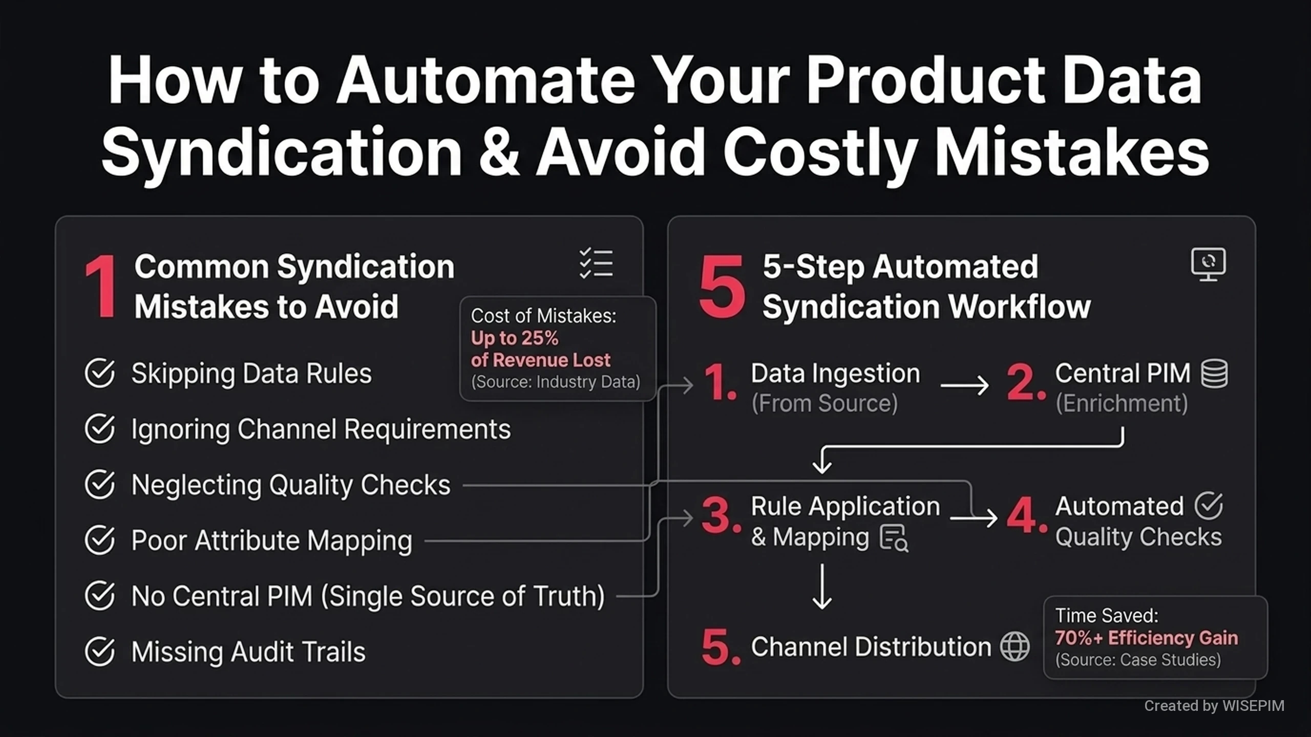 Product data syndication automation is a software process that automatically sends product information from a central system to different sales channels. It uses set rules to share data with webshops, marketplaces, and other tools. This technology removes the need for manual data entry. It reduces errors and keeps your product listings up to date across all platforms. The system matches your data to the specific rules of each sales channel. You can schedule these updates to happen automatically. Automation sends descriptions, images, and prices in the correct format every time. This saves your team hours of manual work. WISEPIM manages these data flows to keep your e-commerce business running smoothly.