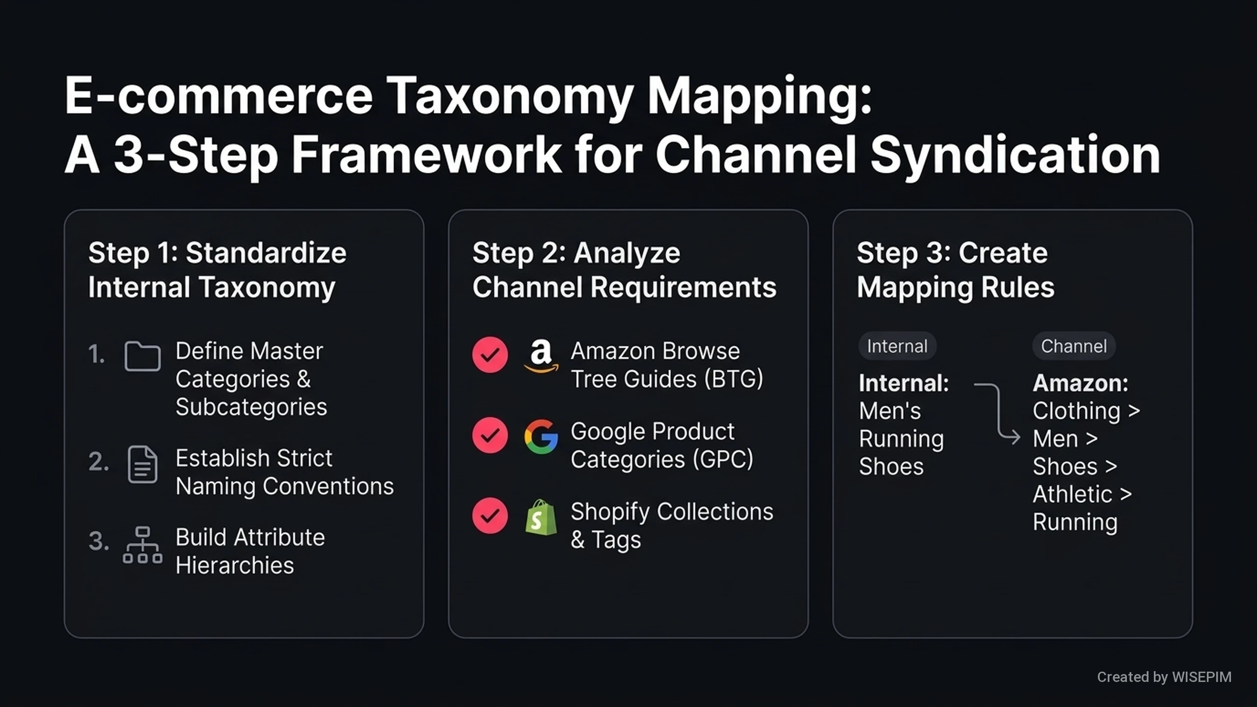 Product data taxonomy mapping matches your internal product categories to the specific requirements of different sales channels. It ensures your items appear in the correct sections on sites like Amazon or Google Shopping. Without accurate mapping, marketplaces may reject your products due to missing information. If a product is in the wrong category, customers cannot find it using search filters. This leads to lost sales and wasted advertising budgets. Proper mapping helps search algorithms understand your product specifications. Automated mapping reduces manual work for your team. Instead of managing spreadsheets for every channel, a PIM system like WISEPIM uses rules to transform data instantly. This helps you launch seasonal collections or enter new regions much faster. Accurate mapping also improves the shopping experience. It provides consistent, filterable details that help buyers make informed decisions. Using WISEPIM ensures your product data remains organized and visible across all platforms.