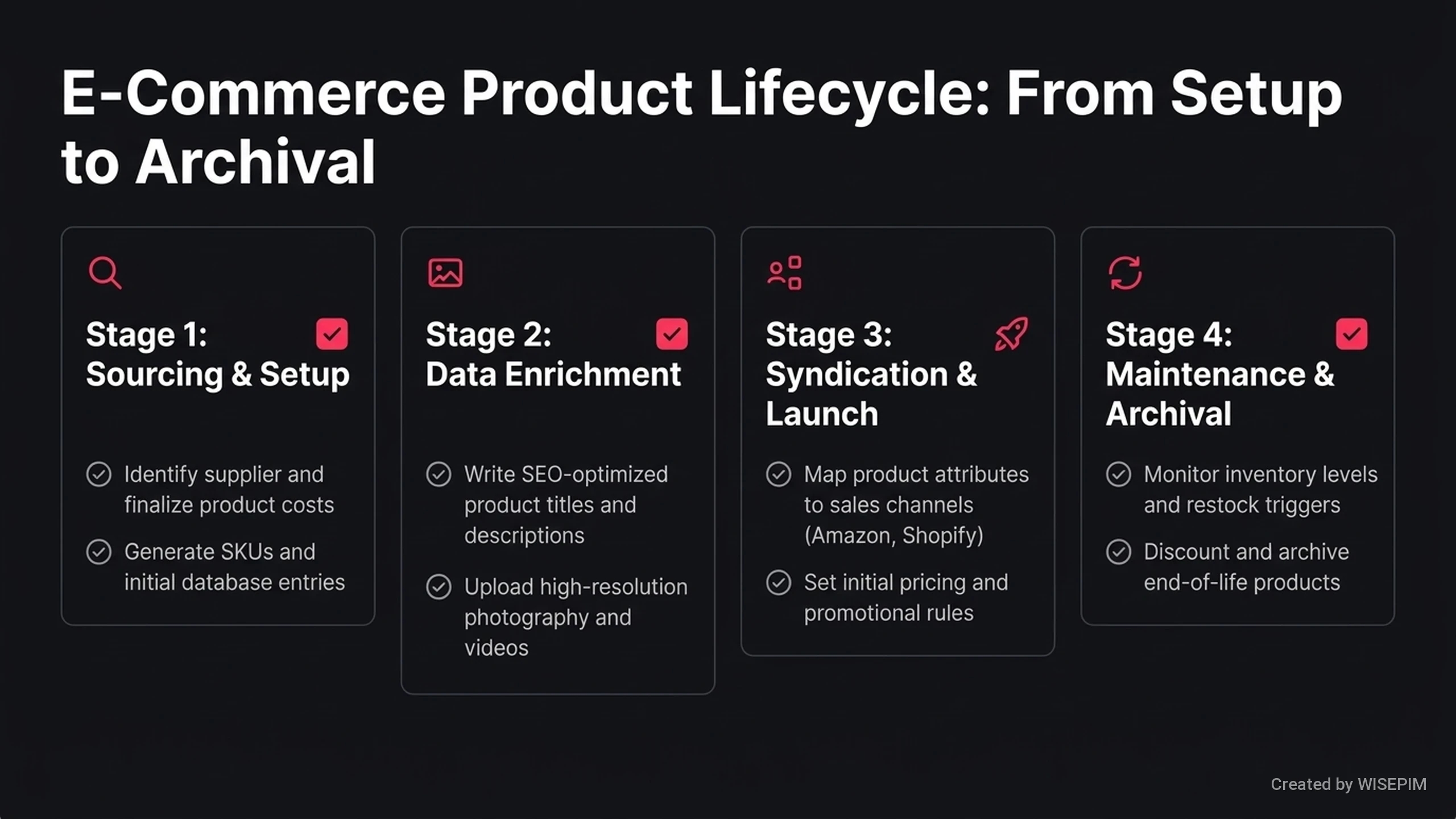 Product Lifecycle Management (PLM) is a process that tracks a product from its first design until it is retired. It manages every stage of a product's life. In a PIM system, PLM focuses on product data at each step. This includes launching new items, updating seasonal details, and tracking different versions. It also handles the final steps when a company stops selling a product. PIM systems use PLM tools to organize tasks and track the status of each item. These tools often include checklists for launches and rules to check data quality. This helps teams work together more efficiently. Traditional PLM systems focus on design and manufacturing. In contrast, PIM-focused PLM prioritizes the data needed for sales and marketing. WISEPIM helps teams manage these stages to ensure product information is accurate and ready for customers.