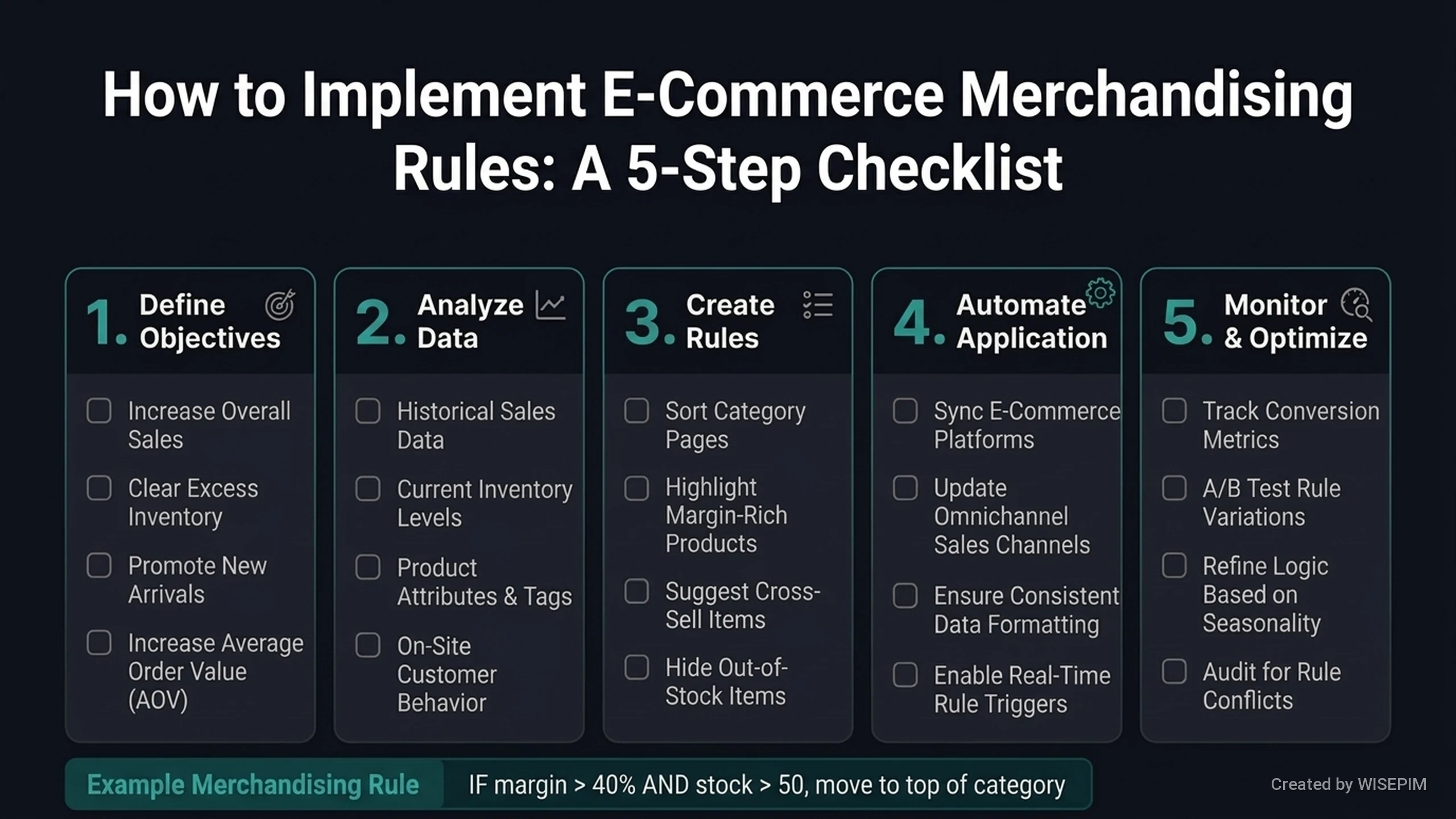 Product merchandising rules are automated settings that control how products appear in an online store. These rules use data like stock levels and sales numbers to decide which items customers see first. They help businesses display the right products at the right time without manual effort. Common examples include: * Moving high-profit items to the top of a page * Hiding products that are out of stock * Showing new arrivals first in search results * Suggesting related items to encourage more sales These rules help companies increase sales and encourage customers to buy more. Once you set the conditions, the system manages the product display automatically. Tools like WISEPIM use these rules to keep your store relevant as inventory and trends change.