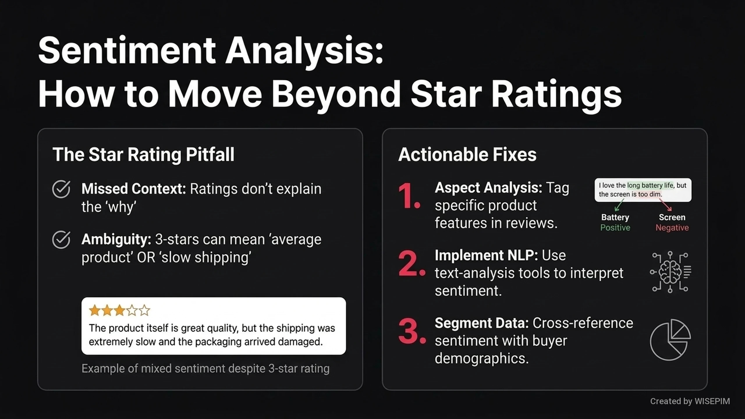 Sentiment analysis is a technology that identifies the emotions or opinions behind customer feedback. It helps e-commerce businesses understand how people feel about their products by scanning reviews and comments. When you integrate this data into a PIM system, you can see which product features people like or dislike. For example, if reviews mention that a waterproof jacket leaks, you can quickly fix the product or update the description. This reduces returns and improves customer trust. This process also reveals the specific words customers use. If shoppers often call a tool "durable," adding that keyword to your PIM data will improve your SEO and sales. You can also use these insights to compare your products against competitors. Tools like WISEPIM help you organize this feedback to make better business decisions.