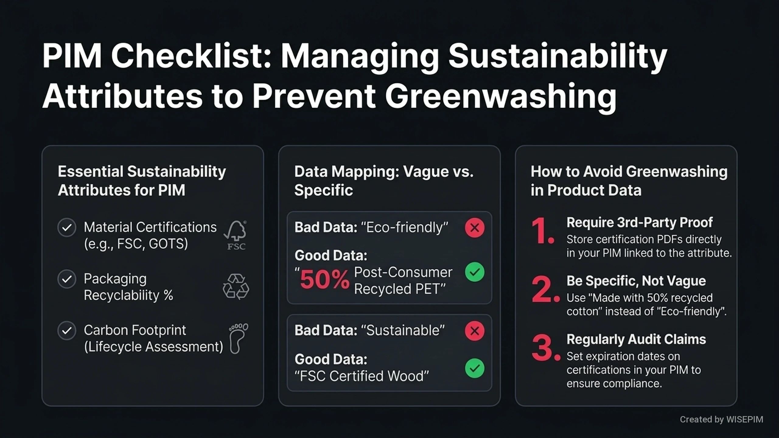 Sustainability attributes are specific pieces of information about a product's effect on the planet and people. They show how a product is made, how long it lasts, and how to dispose of it safely. Shoppers and government rules now require this data to prove a brand is eco-friendly. Common attributes include: * Materials: Using recycled plastic, organic cotton, or fair trade ingredients. * Manufacturing: Measuring how much water or energy a factory uses. * Certifications: Official badges like B Corp, FSC, or the EU Ecolabel. * Lifecycle: The total carbon footprint and how easy it is to repair or recycle the item. These details help customers buy with confidence. A PIM system like WISEPIM organizes these facts so they stay consistent on every website and store shelf.