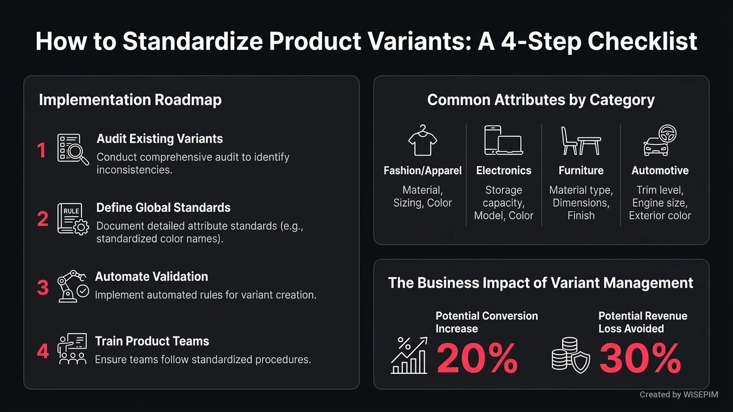 Variant management is a system for organizing products that come in different versions. These versions might include different sizes, colors, or materials. It lets customers view all options on a single product page instead of searching through separate listings. Without this process, product data becomes messy and stock levels often show errors. A PIM system like WISEPIM fixes this by linking each version to its own SKU (Stock Keeping Unit). This keeps product details accurate on every webshop and marketplace. Clear options give shoppers more confidence in their purchases. This leads to more sales and fewer returns because customers receive exactly what they expected.