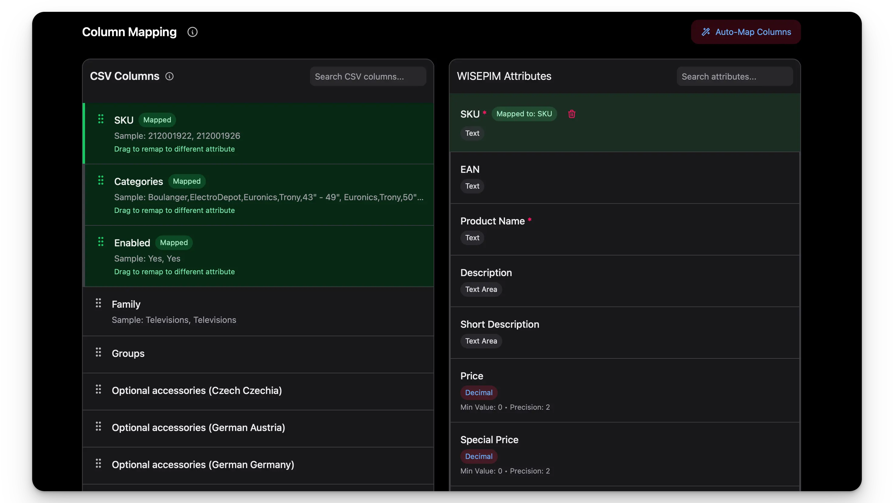 Forget manual field mapping. Our AI analyzes your source data structure and automatically maps it to the right fields in WISEPIM.