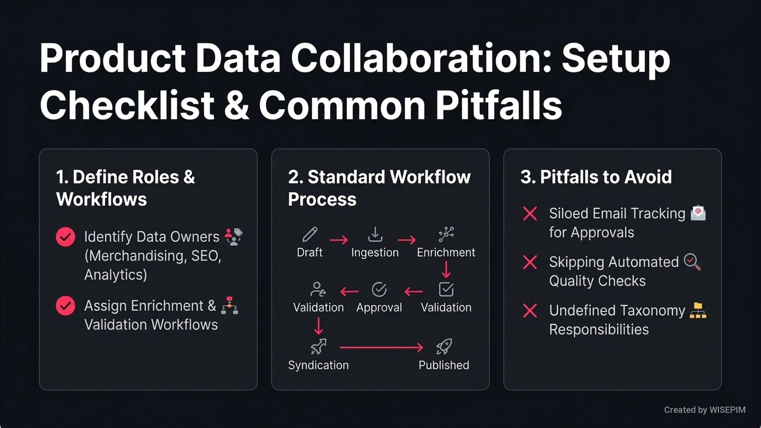 - Met WISEPIM stelt u zelf workflows in voor uw team. Deze stappen helpen bij het maken, verrijken en goedkeuren van alle productdata.