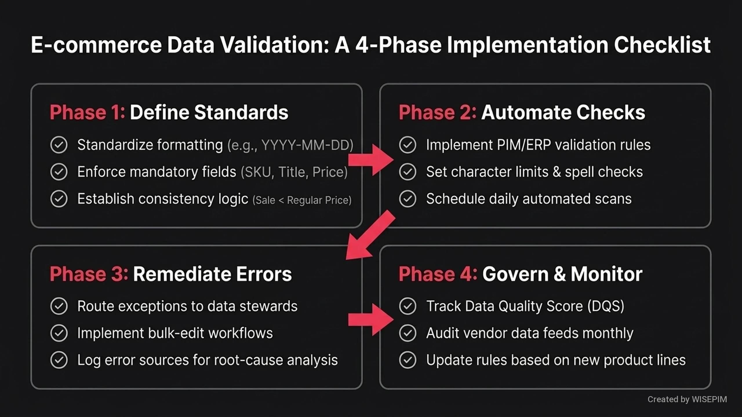 Een productdata validatie framework is een systeem van regels om de kwaliteit van uw productinformatie te controleren. Dit framework bepaalt aan welke eisen uw data precies moet voldoen. Het zorgt ervoor dat alle informatie klopt en volledig is voordat u deze naar uw verkoopkanalen stuurt. Dit framework koppelt uw eigen bedrijfsregels aan slimme software. Een PIM-systeem zoals WISEPIM gebruikt deze regels om controles automatisch uit te voeren. De software ziet direct of een SKU klopt of dat er belangrijke kenmerken ontbreken. Zo publiceert u alleen betrouwbare informatie op uw webshop of marktplaatsen. U voorkomt hiermee fouten in uw uitingen en biedt klanten een betere ervaring.
