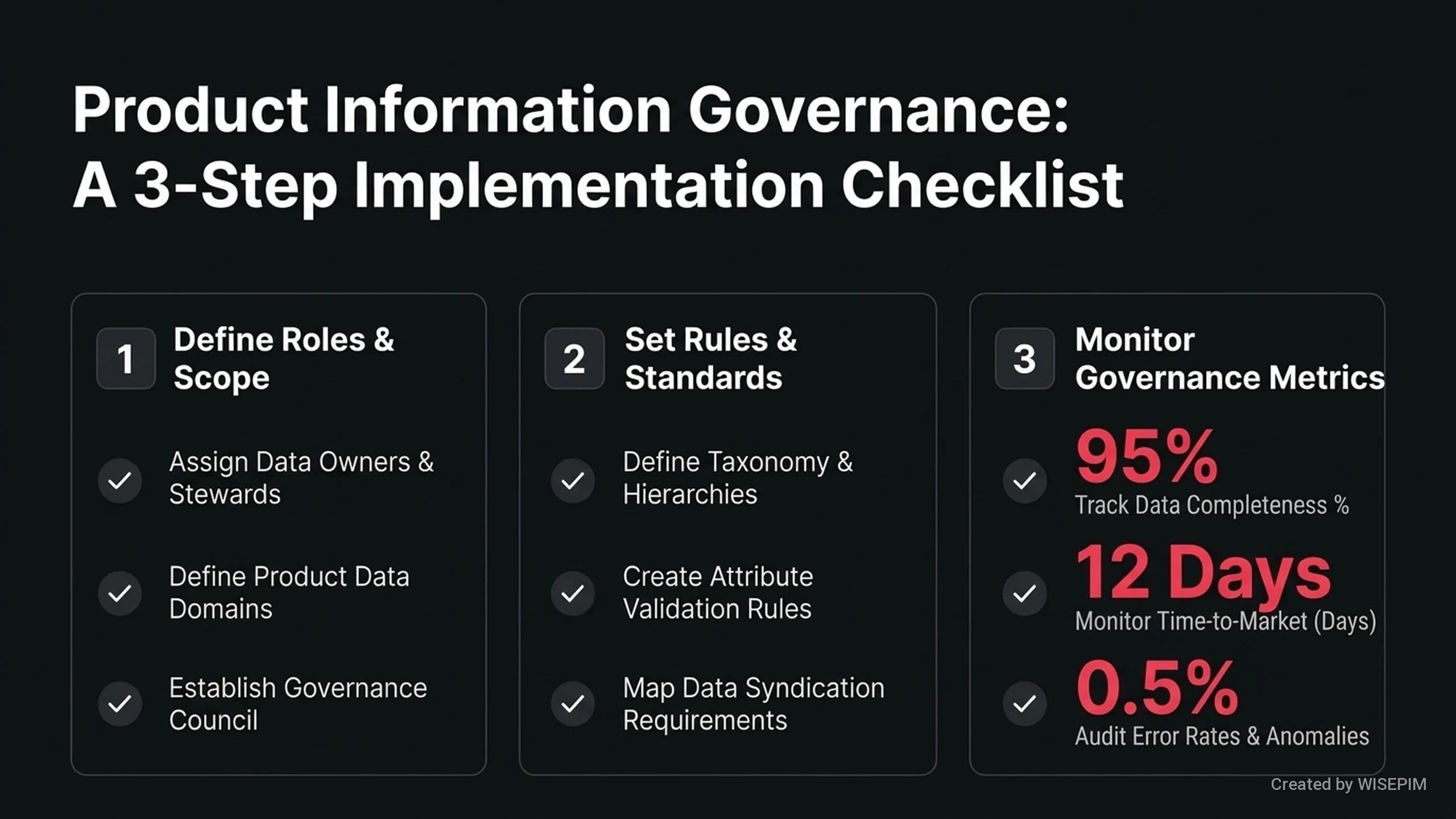 Een productinformatie governance framework definieert beleid, processen, rollen en metrics om de kwaliteit, veiligheid en compliance van productinformatie te waarborgen.